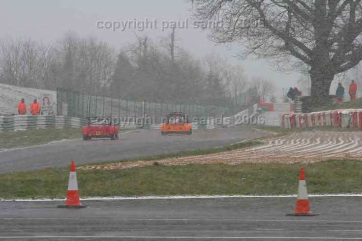 Locosts were the first group out on track for Qualifying and as we all got queued up there was a long delay whilst we waited for the doctor to return to the circuit. (I think someone had collapsed in the paddock and he’d gone to look after them). This meant a long delay and whilst we waited the snow started coming down thick and fast. By the time we got on track it was with wings covered in snow and icy visors!
