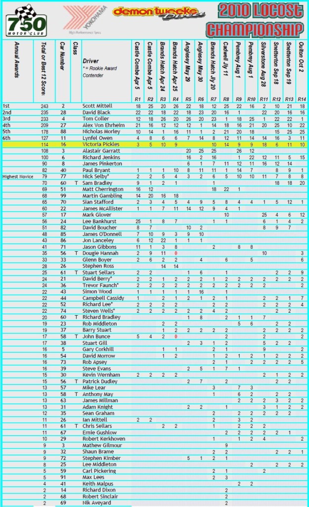 Points are awarded as shown below to all competitors listed in the final results. Each drivers final total is calculated by totaling their best 12 points results from the 14 Championship Rounds.